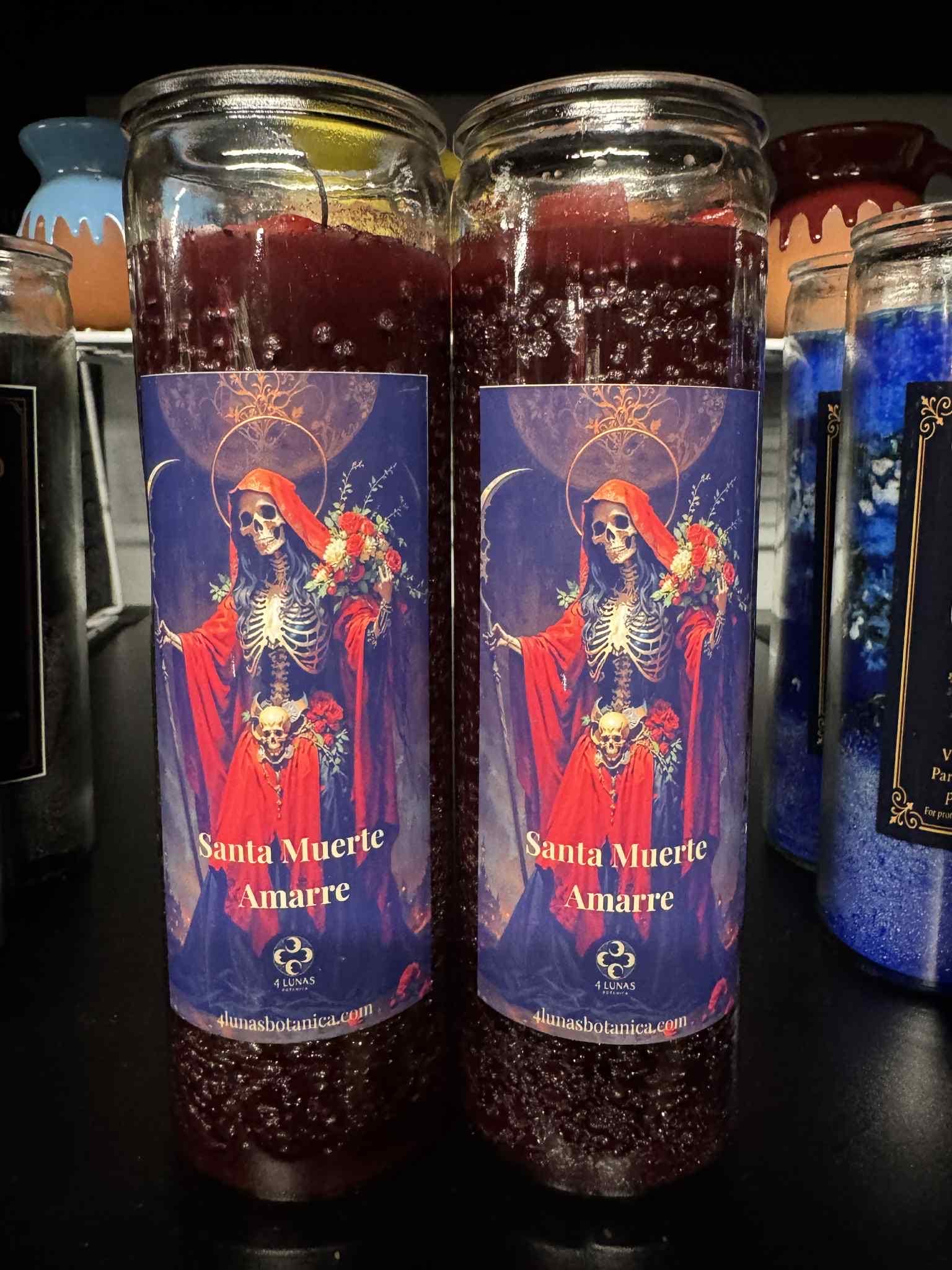 7-Day Santa Muerte Ritual Candle – Handmade by 4 Lunas Botanica Honor the powerful energy of Santa Muerte with this 7-day ritual candle, hand-poured by 4 Lunas Botanica. Infused with carefully selected herbs and oils, this candle is crafted to support protection, guidance, transformation, and spiritual justice under the watchful presence of Santa Muerte.