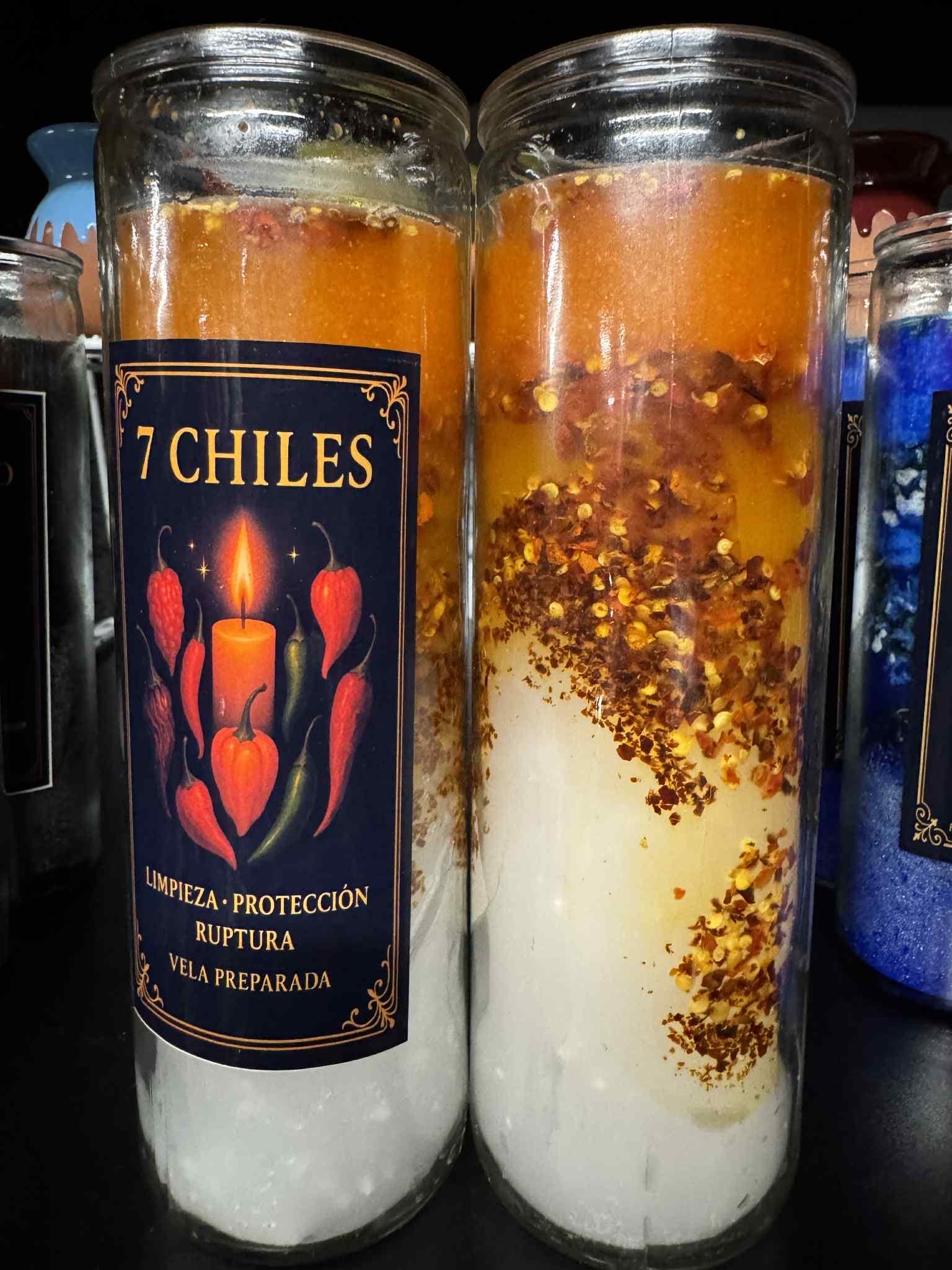 7 Chiles (Seven Peppers) 7-Day Ritual Candle – Handmade by 4 Lunas Botanica Harness fiery energy and protection with the 7 Chiles (Seven Peppers) Candle. Hand-poured in small batches by 4 Lunas Botanica, this candle is infused with seven types of chili peppers and carefully selected herbs and oils to repel negativity, remove obstacles, and ignite personal power.