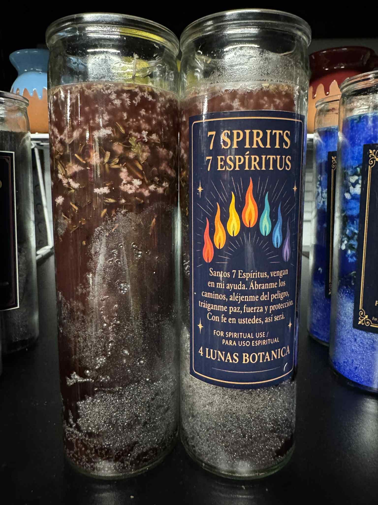 7 Spirits 7-Day Ritual Candle – Handmade by 4 Lunas Botanica Connect with spiritual guidance, protection, and transformation with the 7 Spirits 7-Day Candle. Hand-poured in small batches by 4 Lunas Botanica, this candle is infused with herbs, oils, and intention to invite the support of benevolent spiritual energies and ancestral guidance into your life.