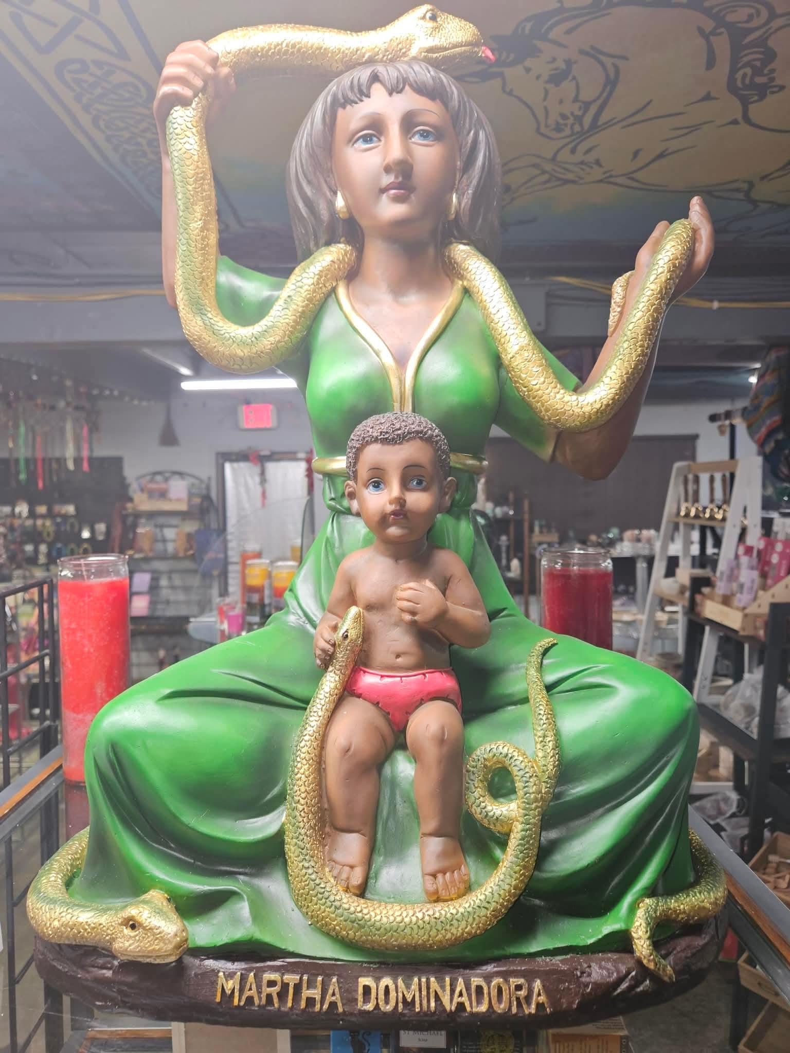 This impressive Martha Dominadora altar figure stands 48 inches tall, making it a powerful and commanding presence for any spiritual space, altar, or devotional setup.