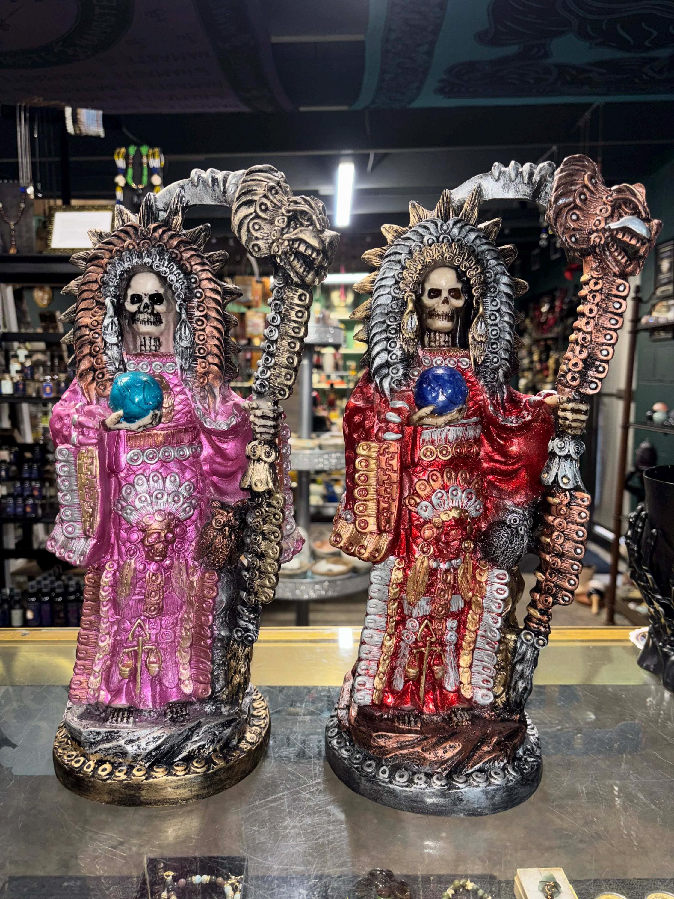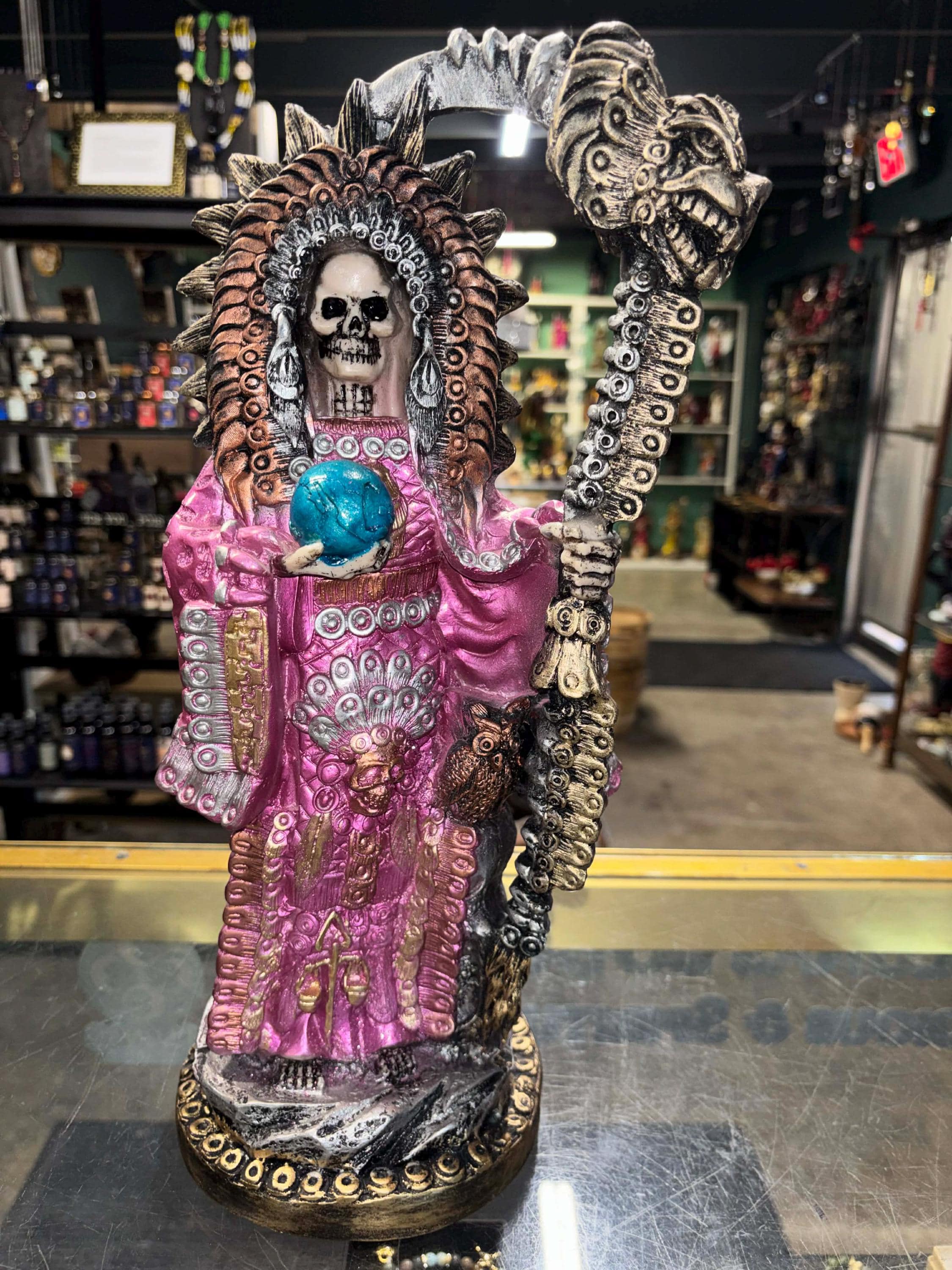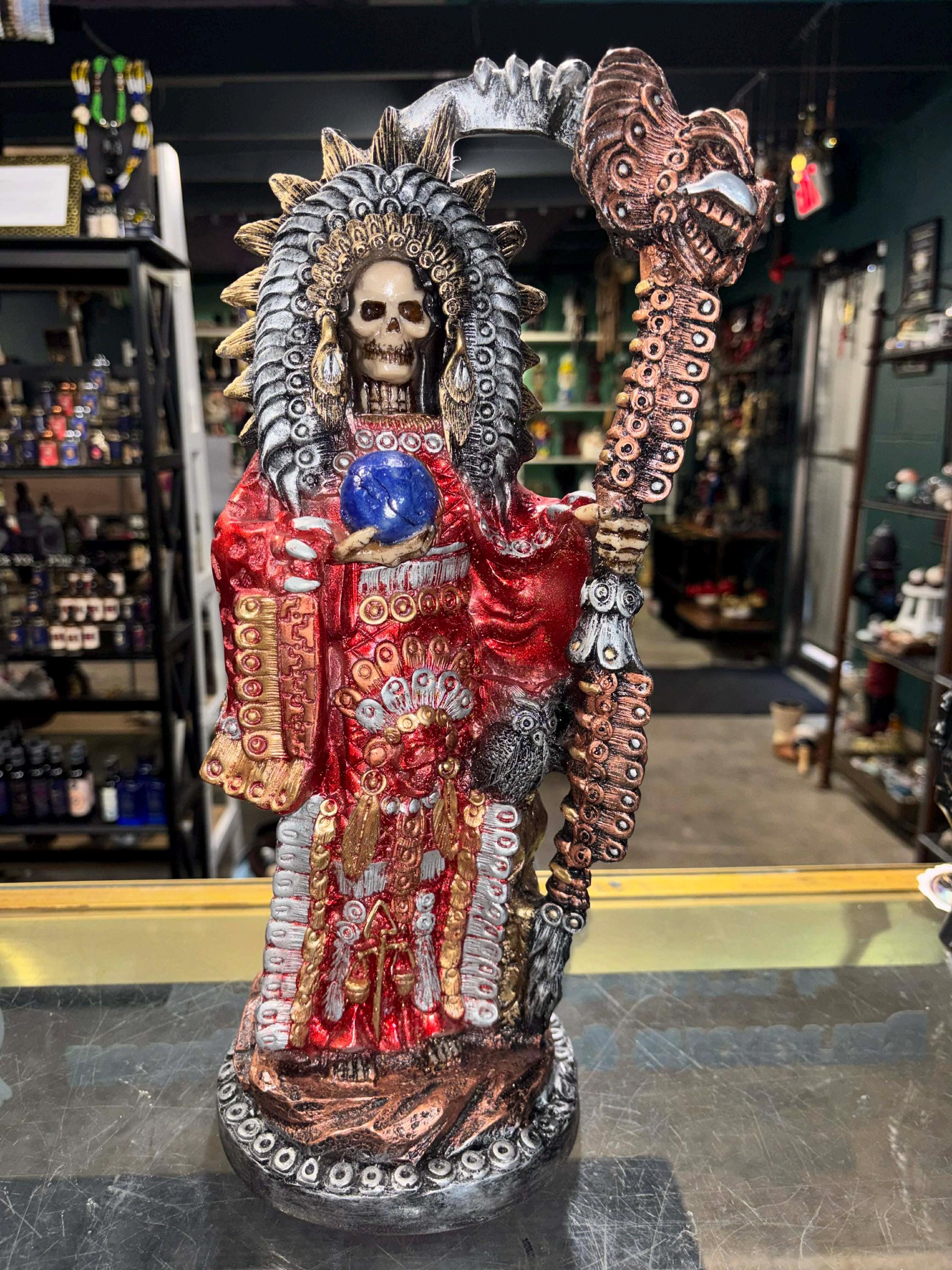 Santa Muerte Aztec style statue crafted with detailed ancestral design, featuring La Santa Muerte holding a globe and serpent staff representing power, control, protection, and spiritual authority over all paths. This piece blends traditional Santa Muerte devotion with strong Aztec-inspired symbolism, making it a powerful addition to any altar or sacred space.