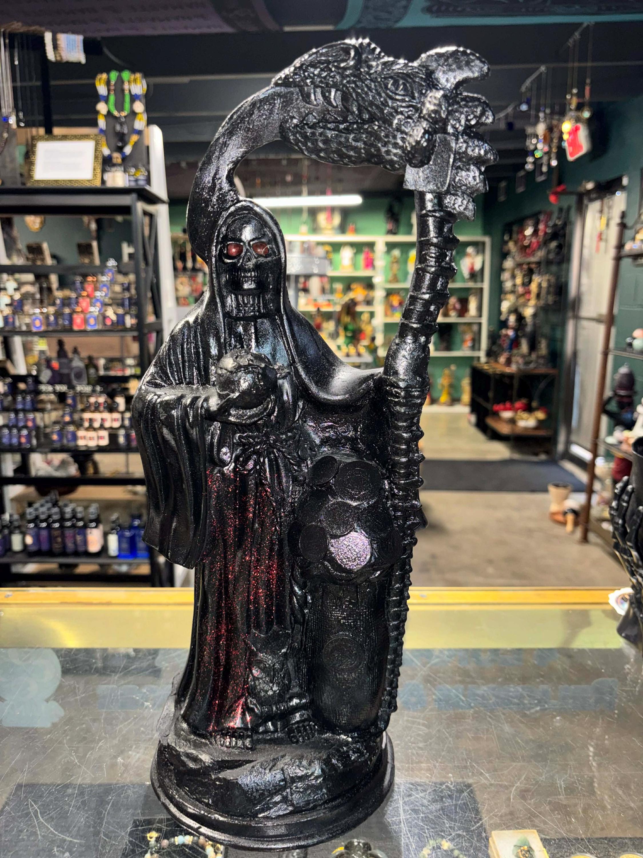 Detailed with a dragon head scythe, skull imagery, and dark finish, this statue carries a bold and commanding presence. The globe represents control over one’s path, while the scythe is used to cut through negativity, enemies, and spiritual blockages.