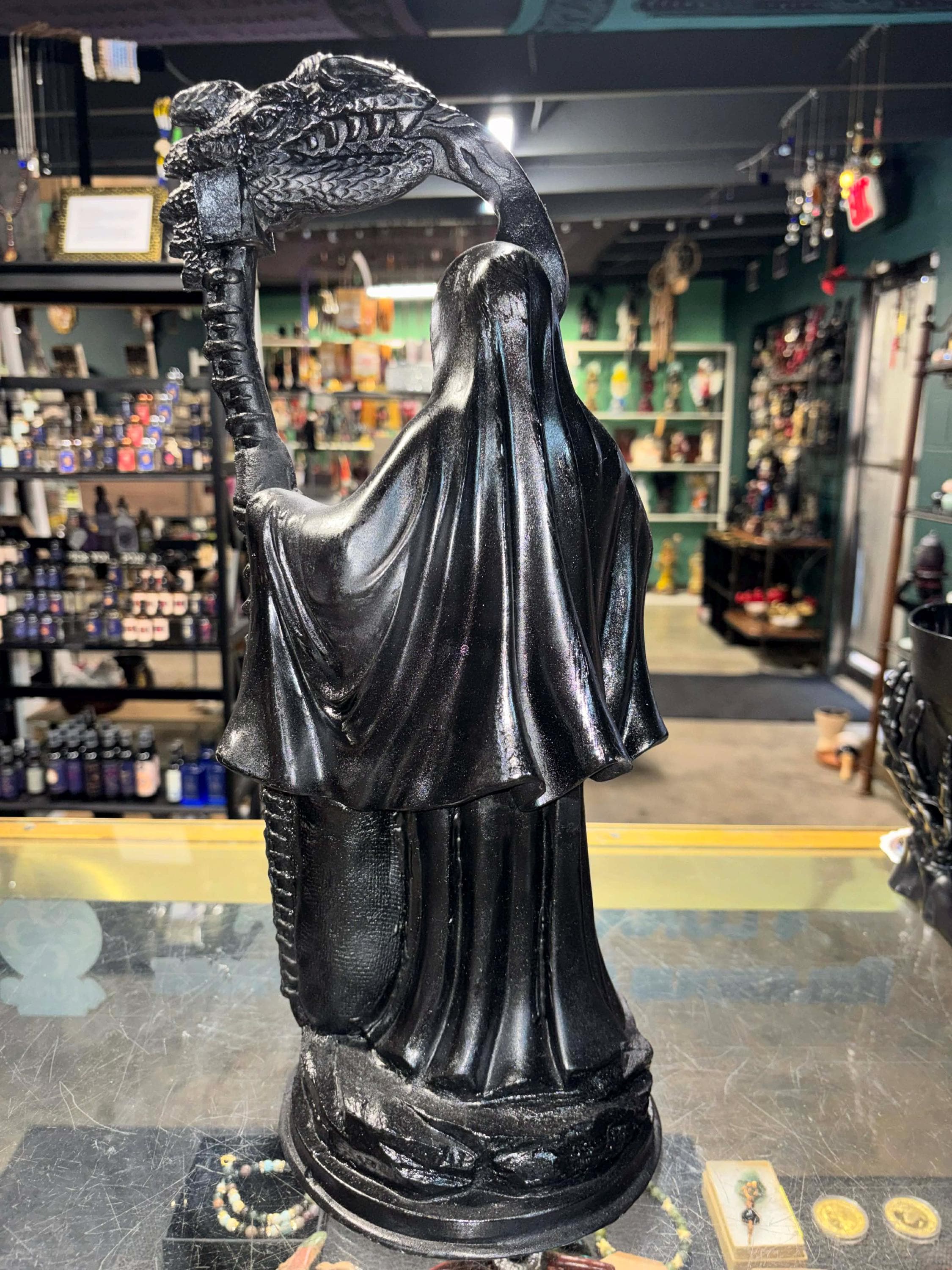 Santa Muerte black statue featuring La Santa Muerte holding a dragon scythe and globe, symbolizing protection, dominance, power, and control over negative forces. The black robe is traditionally used for protection, reversal, and removing obstacles, making this a strong piece for heavy spiritual work and defense.